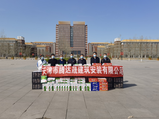 3月31日,在学校封控管理期间,学院收到了天津市腾达晟建筑安装有限公司的爱心捐赠。 天津市腾达晟建筑安装有限公司寇鹏飞经理委托业务经理尹小凯代表公司给学院送来苹果35箱,牛奶35箱,方便面10箱等物资。学院副院...