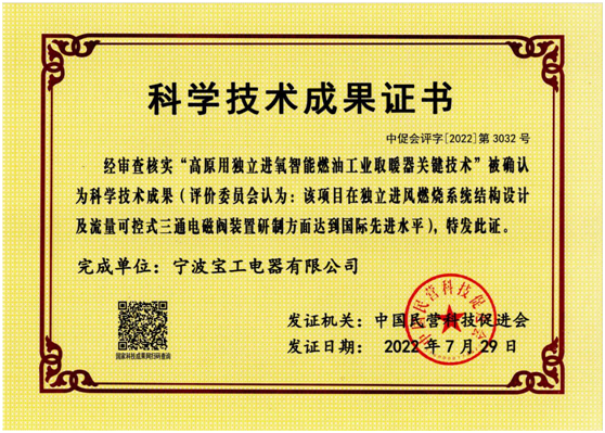 2022年7月15日,中国民营科技促进会(业务主管为国家科学技术部、全国性一级社会团体)在北京主持召开了由宁波宝工电器有限公司完成的“石墨烯电热智能工业暖风机关键技术”和“高原用独立进氧智能燃油工业取暖器关键...
