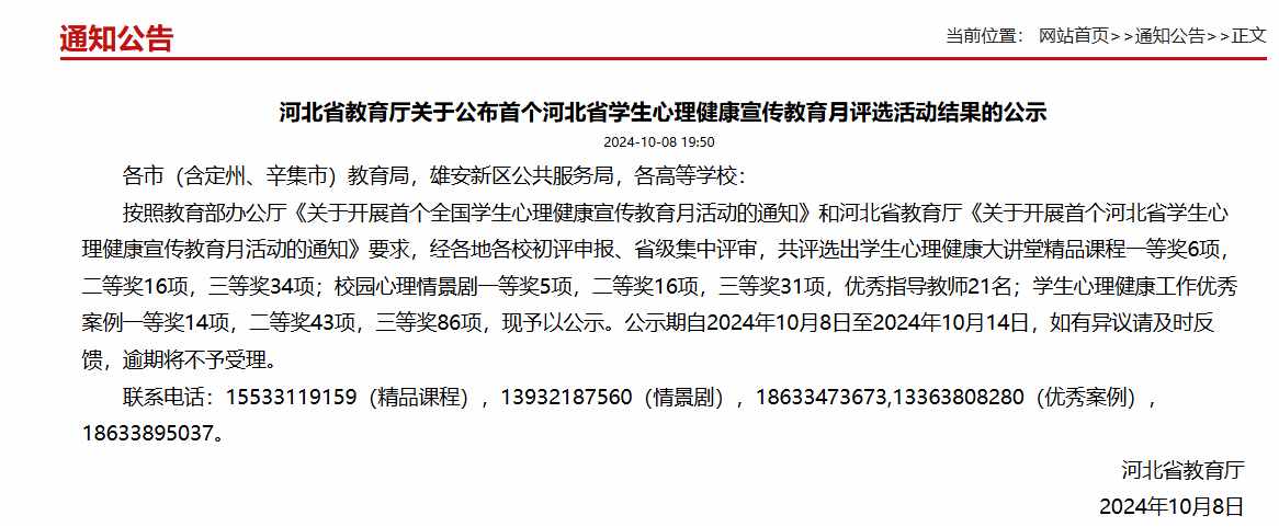 近日,河北省教育厅公布了首个河北省学生心理健康宣传教育月评选活动的结果,我校在河北省学生心理健康宣传教育月活动中喜获佳绩,李立老师的《心晴绽放助力成长,五育并举扬帆起航》《大学生的社恐心理》分别荣获学生心理健康工作优秀案例三等奖、学生心理健康大讲堂精品课程三等奖,王佳慧、寇玉婷老师的《再见,九岁!》荣获校园心理情景剧三等奖。