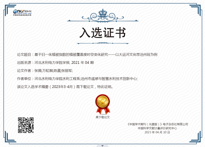 近日,中国知网《学术精要数据库》基于中国知网资源总库,首次发布近12年来高影响力论文榜单,《广发平台,广发网页版学报》2021年第4期发表的《基于归一化植被指数的植被覆盖度时空变化研究——以大运河文化带沧州段为例》(作者:张薇、万虹麟、陈晨、张丽军)、《人脸识别的智能防疫系统设计》(作者:王继超、张丽娟、尤田、孙东来、回振桥)2篇论文入选。